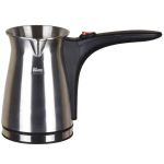 Ηλεκτρικό μπρίκι inox με μαύρη πλαστική λαβή,κατάλληλο για ελληνικό καφέ και ζεστό νερό,είναι 800W,διαθέτει διακόπτη λειτουργίας με φωτεινή ένδειξη,καλυμμένη αντίσταση και αποσπώμενη βάση για εύκολη χρήση.Έχει χωρητικότητα 4 φλυτζάνια καφέ.