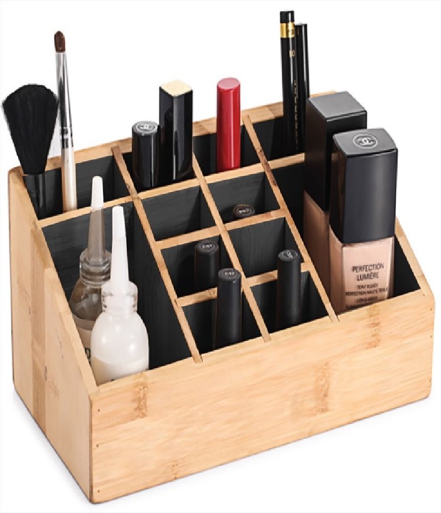Θήκη οργάνωσης καλλυντικών από μπαμπού, δώδεκα θέσεων διαφορετικών διαστάσεων.