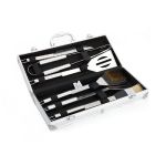 Πλήρες σετ 6 τεμαχίων εργαλείων μπάρμπεκιου σε πρακτική, ανθεκτική κασετίνα μεταφοράς με χειρολαβή. Κατασκευασμένα από ανοξείδωτο ατσάλι. Το σετ περιλαμβάνει: σπάτουλα, μαχαίρι, πινέλο σιλικόνης, βούρτσα καθαρισμού σχάρας, πιρούνα, τσιμπίδα. Διαστάσεις κασετίνας: 37x14x7cm. Μήκος εργαλείων: 35cm.