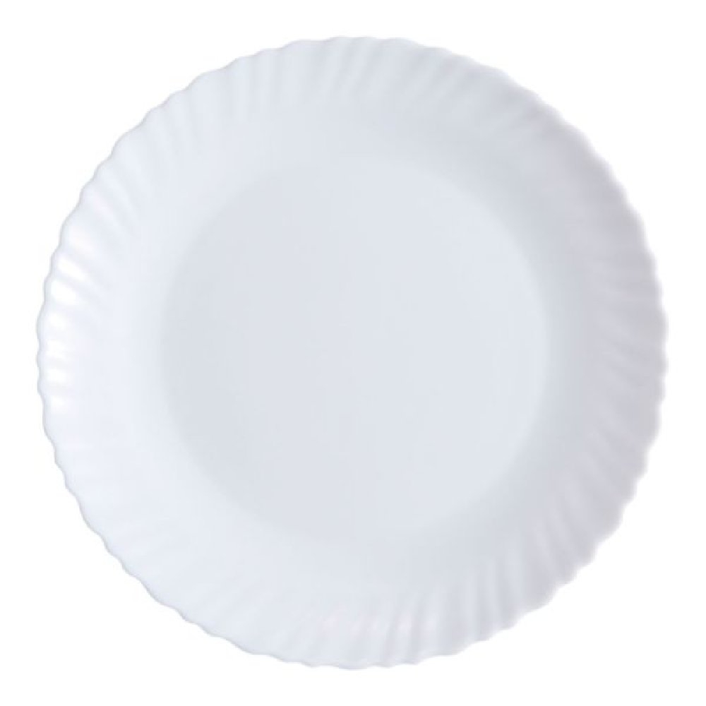 Γυάλινο πιάτο από οπαλίνα σε λευκό χρώμα, στρογγυλό, ανθεκτικό στη θερμότητα και ελαφρύ. Κατάλληλο για πλυντήριο πιάτων και φούρνο μικροκυμάτων, ιδιαίτερα πρακτικό για καθημερινή χρήση.