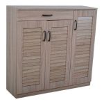 Παπουτσοθήκη ξύλινη με δύο ξεχωριστούς χώρους και ένα συρτάρι, σε φυσική απόχρωση ξύλου με πορτάκια τύπου περσίδας. Διαθέτει εσωτερικούς χώρους μήκους 67εκ. και 35εκ., και δυνατότητα αφαίρεσης δύο ραφιών για την τοποθέτηση ψηλών παπουτσιών όπως μπότες.